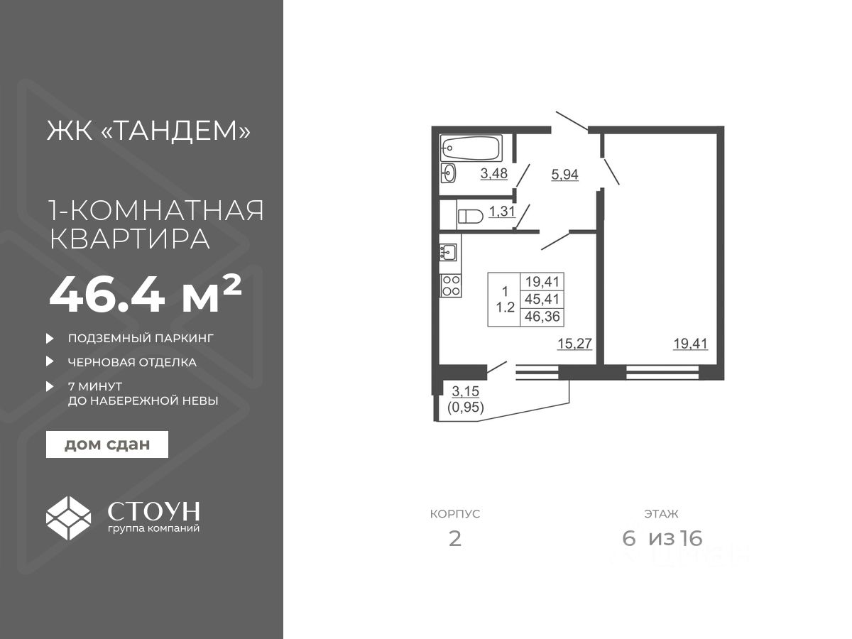 Продается однокомнатная квартира в жилом комплексе "Тандем" от ГК СТОУН нa 6 этаже. Общaя площадь cоcтaвляeт 46.36 кв. м.