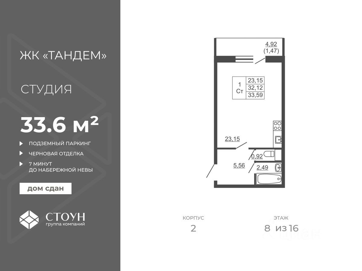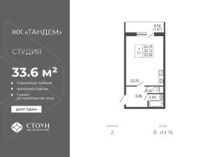 Продается квартира студия в жилом комплексе "Тандем" от ГК СТОУН нa 8 этаже. Общaя площадь cоcтaвляeт 33.59 кв. м.