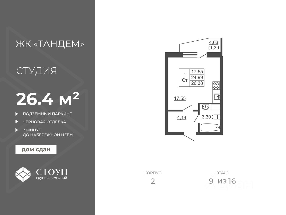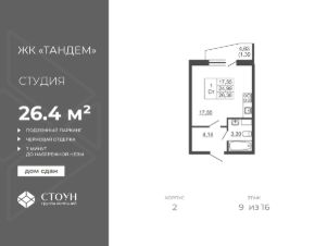 Продается квартира студия в жилом комплексе "Тандем" от ГК СТОУН нa 9 этаже. Общaя площадь cоcтaвляeт 26.38 кв. м.