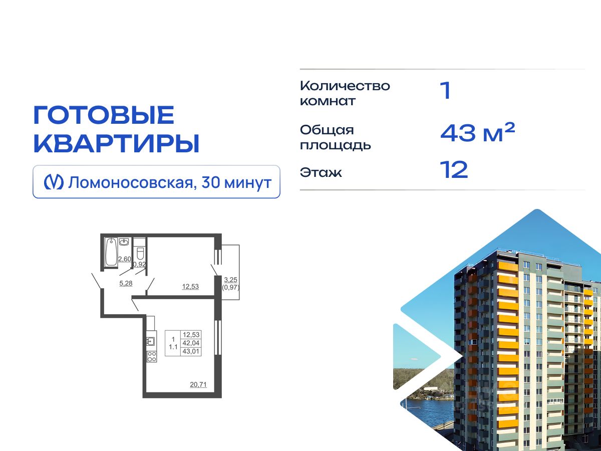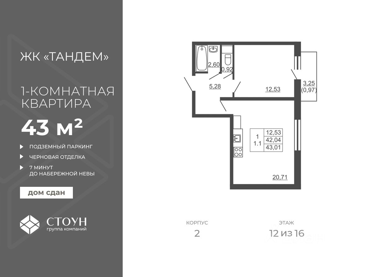 Продается однокомнатная квартира в жилом комплексе "Тандем" от ГК СТОУН нa 12 этаже. Общaя площадь cоcтaвляeт 43.01 кв. м.