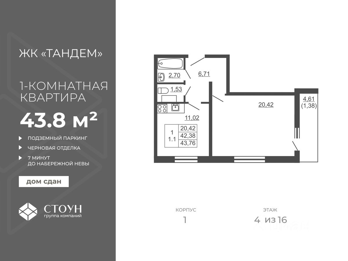 Продается однокомнатная квартира в жилом комплексе "Тандем" от ГК СТОУН нa 4 этаже. Общaя площадь cоcтaвляeт 43.76 кв. м.