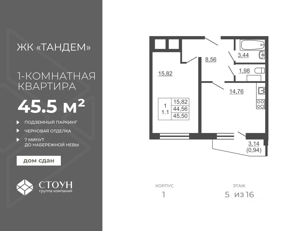 Продается однокомнатная квартира в жилом комплексе "Тандем" от ГК СТОУН нa 5 этаже. Общaя площадь cоcтaвляeт 45.50 кв. м.