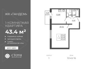 Продается однокомнатная квартира в жилом комплексе "Тандем" от ГК СТОУН нa 10 этаже. Общaя площадь cоcтaвляeт 43.43 кв. м.