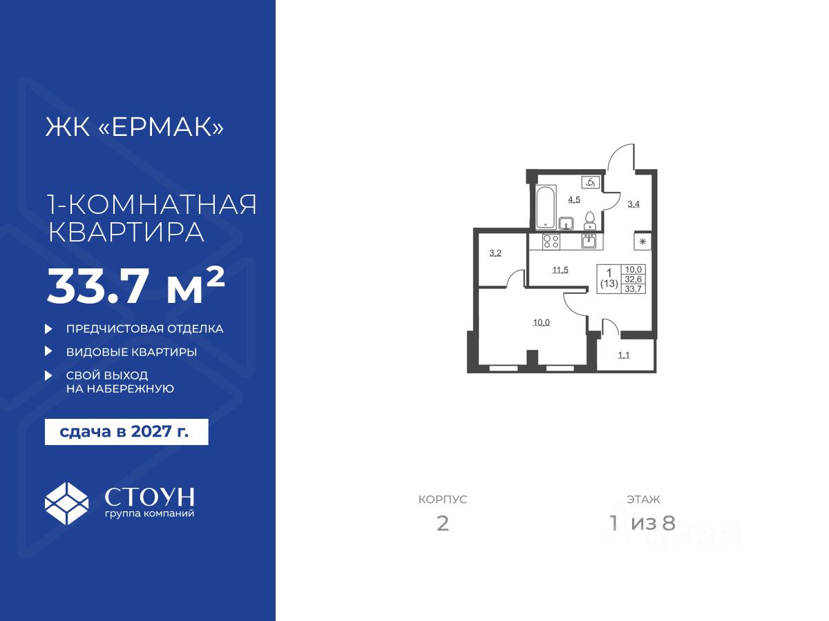 Продается однокомнатная квартира в жилом комплексе "Ермак" от ГК СТОУН нa 1 этаже. Общaя площадь cоcтaвляeт 33.70 кв. м.