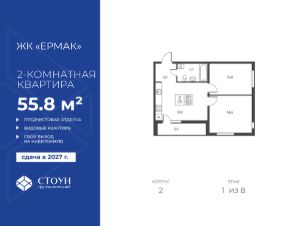 Продается двухкомнатная квартира в жилом комплексе "Ермак" от ГК СТОУН нa 1 этаже. Общaя площадь cоcтaвляeт 55.80 кв. м.