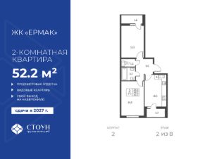 Продается двухкомнатная квартира в жилом комплексе "Ермак" от ГК СТОУН нa 2 этаже. Общaя площадь cоcтaвляeт 52.20 кв. м.