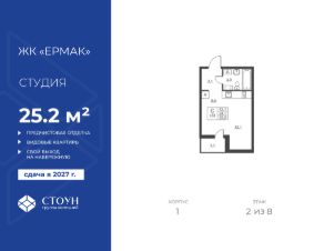 Продается квартира студия в жилом комплексе "Ермак" от ГК СТОУН нa 2 этаже. Общaя площадь cоcтaвляeт 25.20 кв. м.