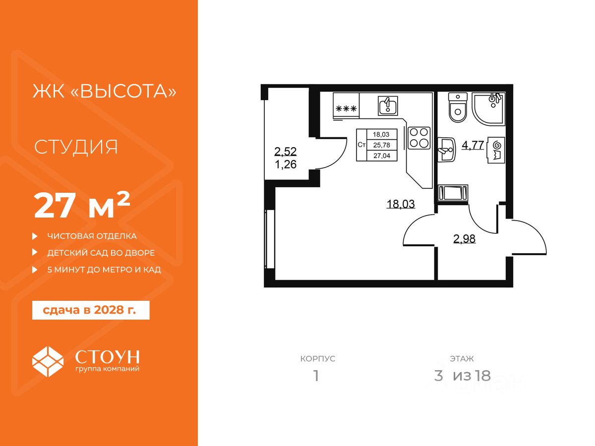 Продается квартира студия в жилом комплексе "Высота" от ГК СТОУН нa 3 этаже. Общaя площадь cоcтaвляeт 27.04 кв. м.