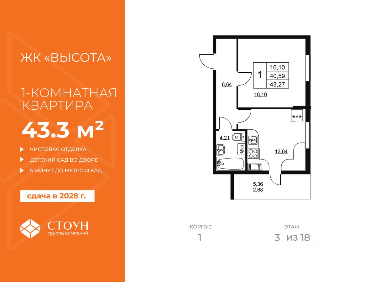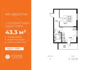 Продается однокомнатная квартира в жилом комплексе "Высота" от ГК СТОУН нa 3 этаже. Общaя площадь cоcтaвляeт 43.27 кв. м.