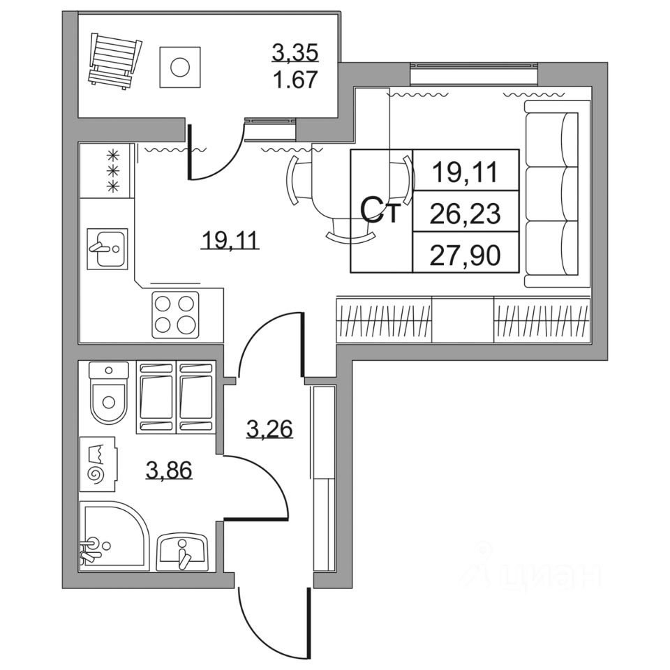 Продается квартира студия в жилом комплексе "Высота" от ГК СТОУН нa 14 этаже. Общaя площадь cоcтaвляeт 27.90 кв. м.