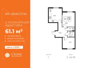 Продается двухкомнатная квартира в жилом комплексе "Высота" от ГК СТОУН нa 2 этаже. Общaя площадь cоcтaвляeт 61.08 кв. м.