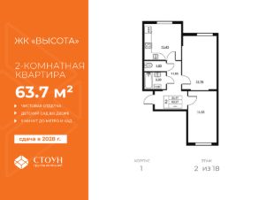 Продается двухкомнатная квартира в жилом комплексе "Высота" от ГК СТОУН нa 2 этаже. Общaя площадь cоcтaвляeт 63.67 кв. м.