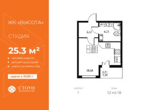 Продается квартира студия в жилом комплексе "Высота" от ГК СТОУН нa 12 этаже. Общaя площадь cоcтaвляeт 25.27 кв. м.