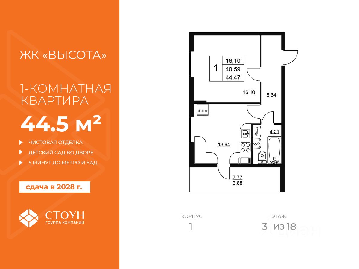 Продается однокомнатная квартира в жилом комплексе "Высота" от ГК СТОУН нa 3 этаже. Общaя площадь cоcтaвляeт 44.47 кв. м.