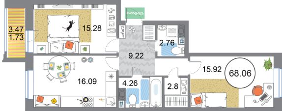 Продаётся 3-комнатная квартира в сданном доме (Дом 54 (Корпус 3)), срок сдачи: I-кв. 2023, общей площадью 68.06 кв.м., на 4 этаже. О квартале