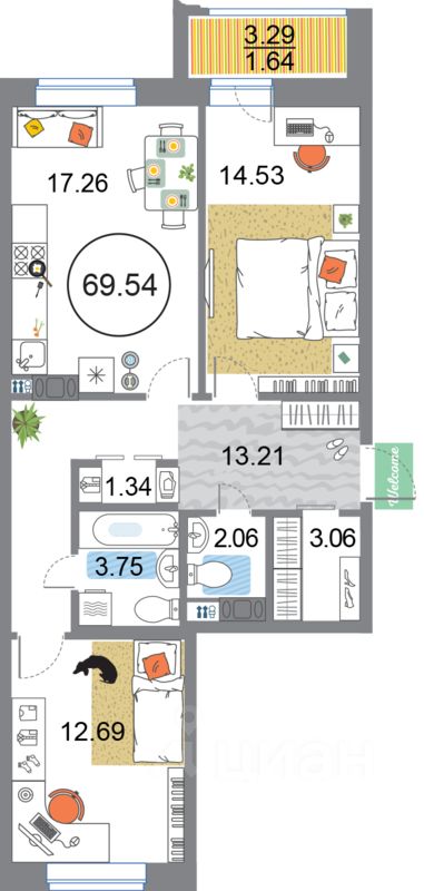 Продаётся 3-комнатная квартира в сданном доме (Дом 54 (Корпус 3)), срок сдачи: I-кв. 2023, общей площадью 69.54 кв.м., на 7 этаже. О квартале