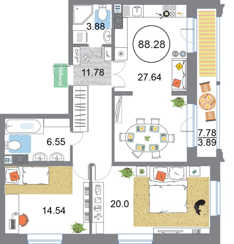 Продаётся 3-комнатная квартира в сданном доме (Дом 54 (Корпус 3)), срок сдачи: I-кв. 2023, общей площадью 88.28 кв.м., на 6 этаже. О квартале