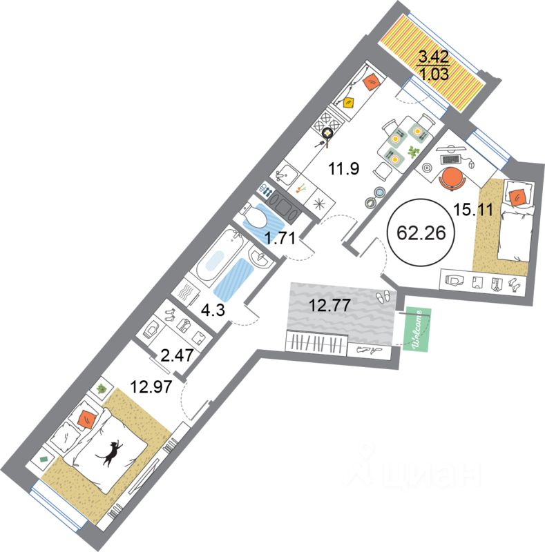 Продаётся 2-комнатная квартира в сданном доме (Дом 54 (Корпус 3)), срок сдачи: I-кв. 2023, общей площадью 62.26 кв.м., на 12 этаже. О квартале