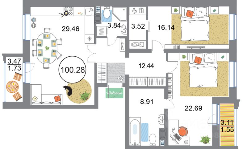 Продаётся 3-комнатная квартира в сданном доме (Дом 54 (Корпус 3)), срок сдачи: I-кв. 2023, общей площадью 100.28 кв.м., на 7 этаже. О квартале