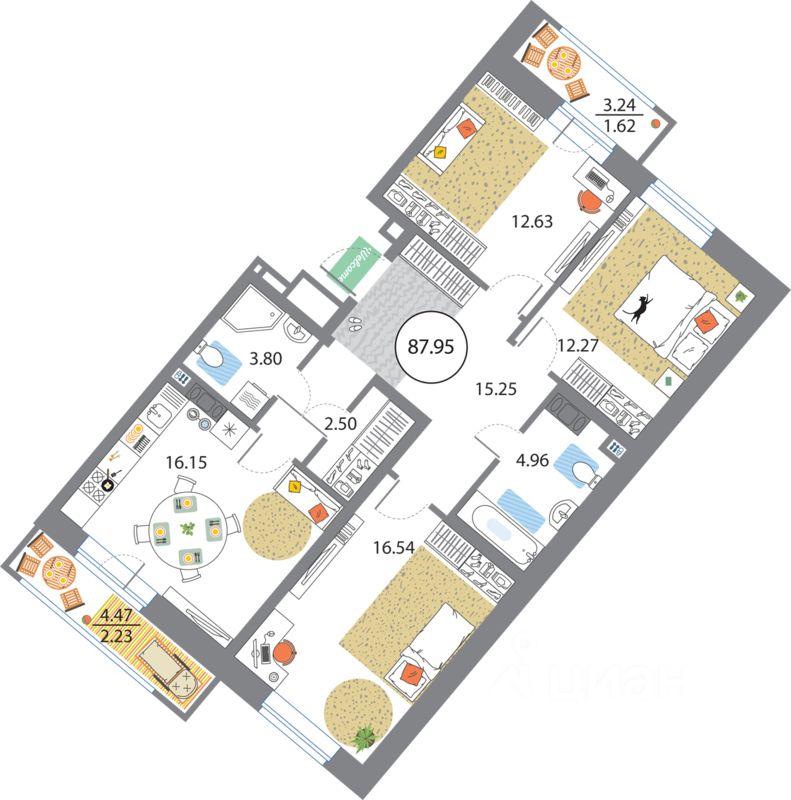 Продаётся 3-комнатная квартира в сданном доме (Дом 54 (Корпус 2)), срок сдачи: III-кв. 2022, общей площадью 87.95 кв.м., на 7 этаже. О квартале
