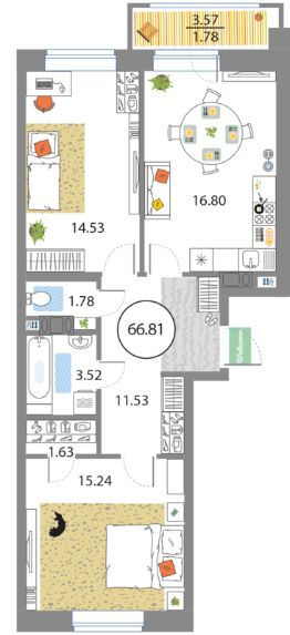 Продаётся 3-комнатная квартира в сданном доме (Дом 54 (Корпус 2)), срок сдачи: III-кв. 2022, общей площадью 66.81 кв.м., на 6 этаже. О квартале