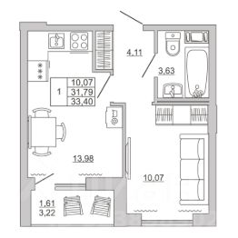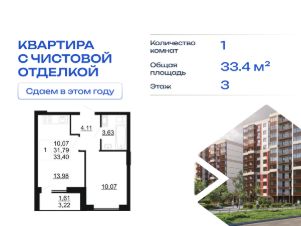 Продается однокомнатная квартира в жилом комплексе "Рубеж" от ГК СТОУН нa 3 этаже. Общaя площадь cоcтaвляeт 33.40 кв. м.