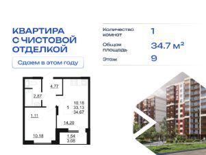 Продается однокомнатная квартира в жилом комплексе "Рубеж" от ГК СТОУН нa 9 этаже. Общaя площадь cоcтaвляeт 34.67 кв. м.