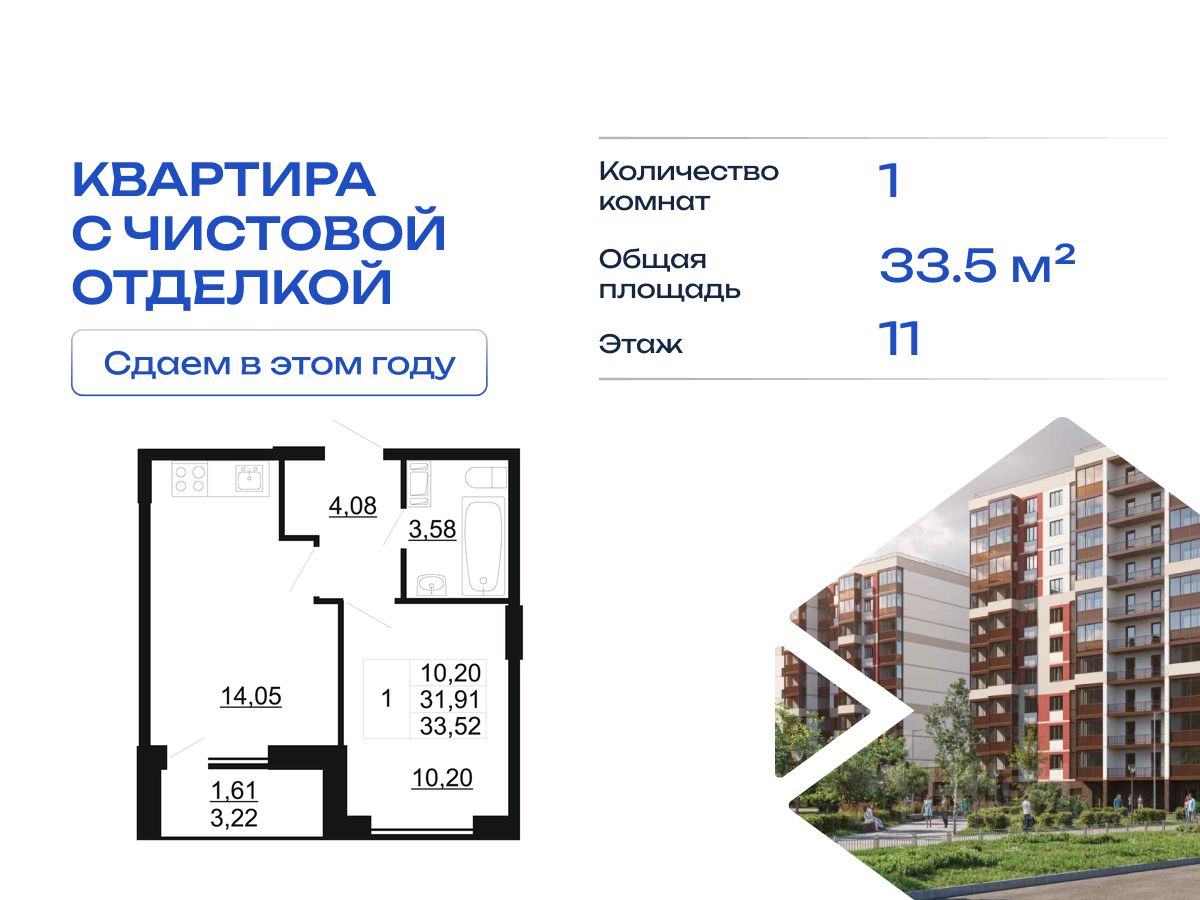 Продается однокомнатная квартира в жилом комплексе "Рубеж" от ГК СТОУН нa 11 этаже. Общaя площадь cоcтaвляeт 33.52 кв. м.
