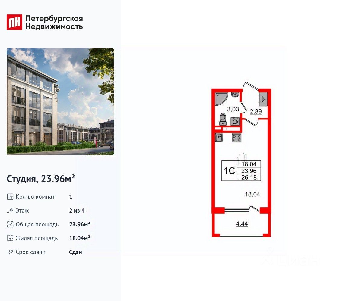 Удобная, классическая, функциональная европланировка, вместительная прихожая 2.89 м². Общая площадь студии - 23.96 м², жилая 18.04 м², высота потолка 2.77 м.