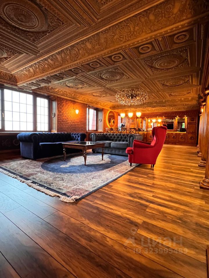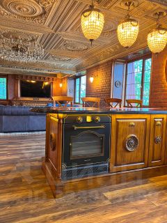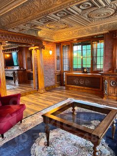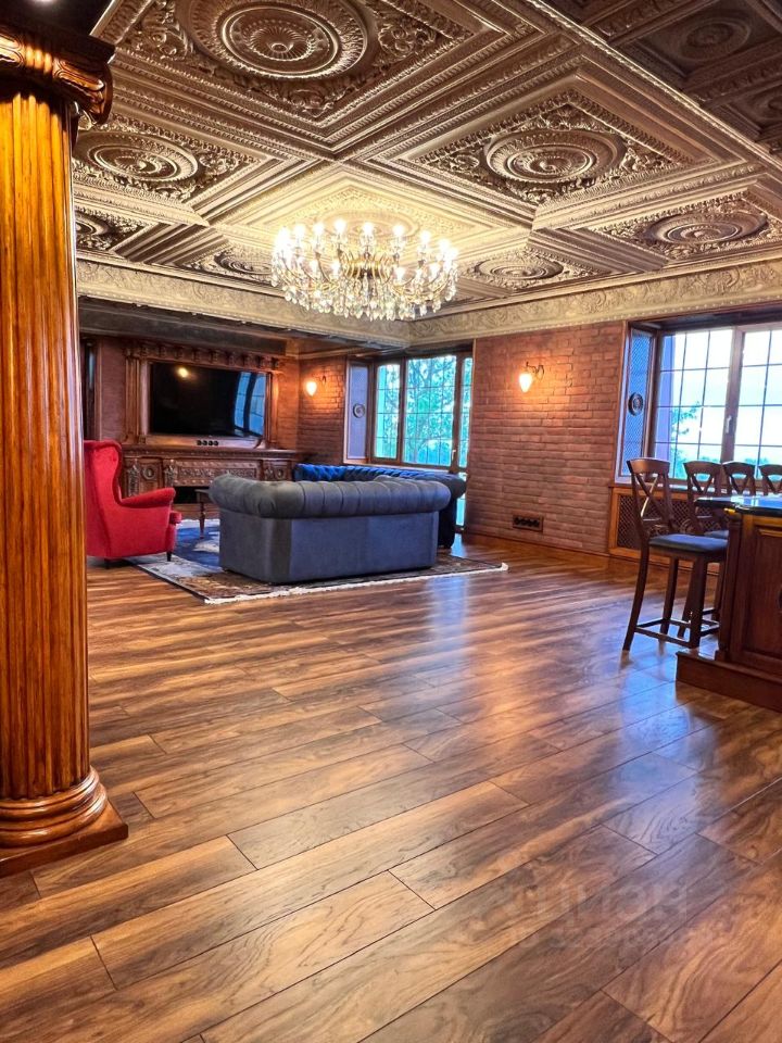 Основное помещение включает в себя зону отдыха с большим телевизором, декоративным камином, двумя раскладными диванами и креслом.
