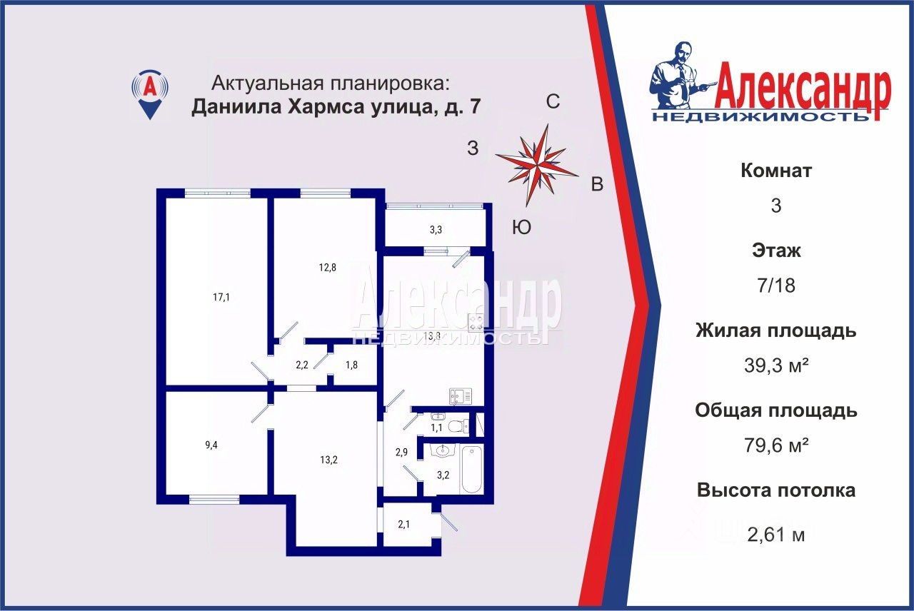Общая площадь квартиры: 79,60 кв.м. Жилая площадь: 39,30 кв.м.