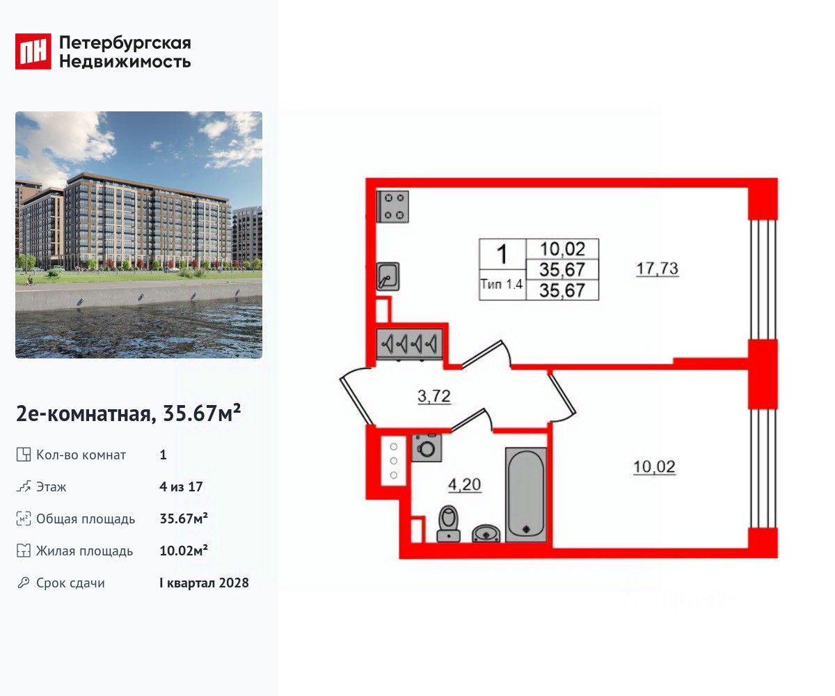 Удобная, классическая, функциональная европланировка, большая кухня-гостиная 17.73 м², вместительная прихожая 3.72 м². Общая площадь квартиры - 35.67 м², жилая 10.02 м², высота потолка 2.77 м.