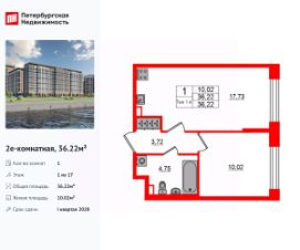 Удобная, классическая, функциональная европланировка, большая кухня-гостиная 17.73 м², вместительная прихожая 3.72 м². Общая площадь квартиры - 36.22 м², жилая 10.02 м², высота потолка 3 м.