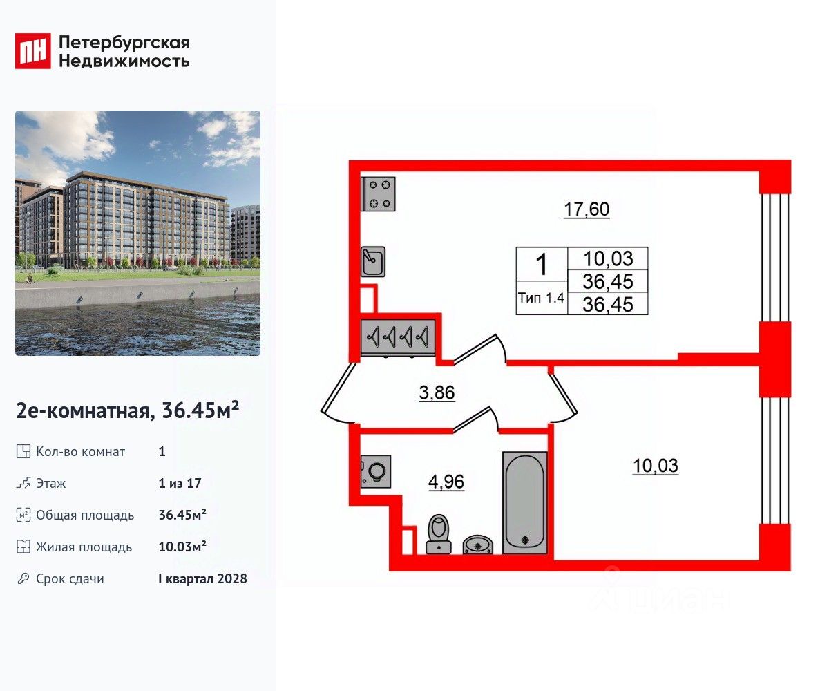 Удобная, классическая, функциональная европланировка, большая кухня-гостиная 17.6 м², вместительная прихожая 3.86 м². Общая площадь квартиры - 36.45 м², жилая 10.03 м², высота потолка 3 м.