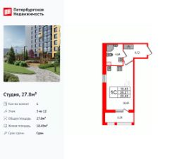 Удобная, классическая, функциональная европланировка, просторная прихожая 5.12 м². Общая площадь студии - 27.8 м², жилая 18.45 м², высота потолка 2.77 м.