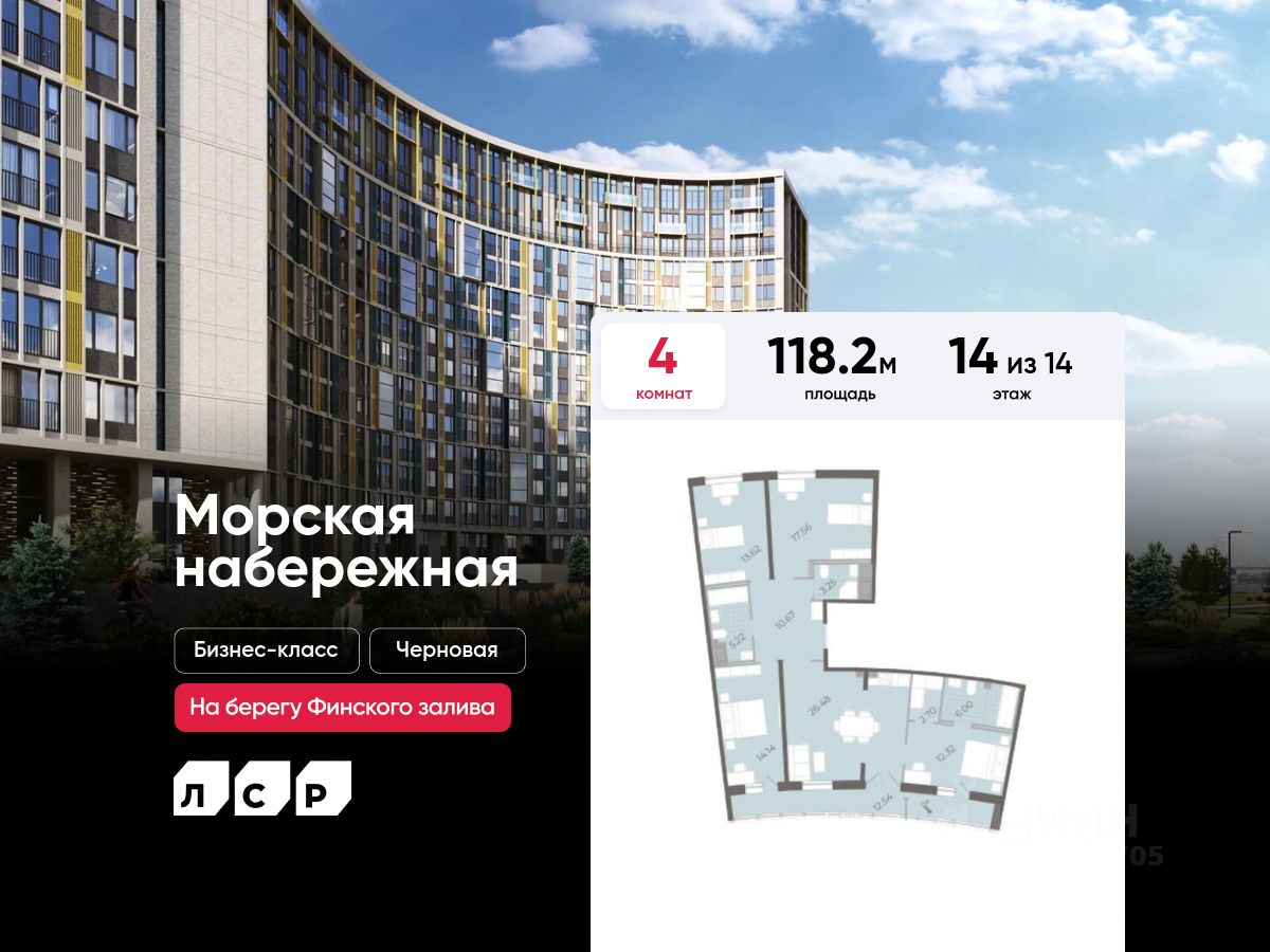 Продается 4-комнатная квартира в ЖК "Морская набережная" на 14 этаже. Общая площадь составляет 118.20 кв. м. Квартира без отделки. Жилой комплекс "Морская набережная" располагается по адресу Санкт-Петербург, Василеостровский.