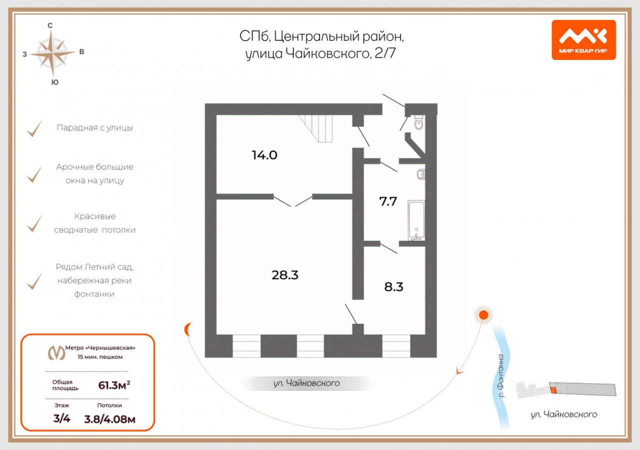 В пешей доступности: Летний сад, Михайловский парк, Спас на Крови, Соляной переулок, Михайловский замок, Марсово поле, Эрмитаж, Дворцовая площадь и многое многое.