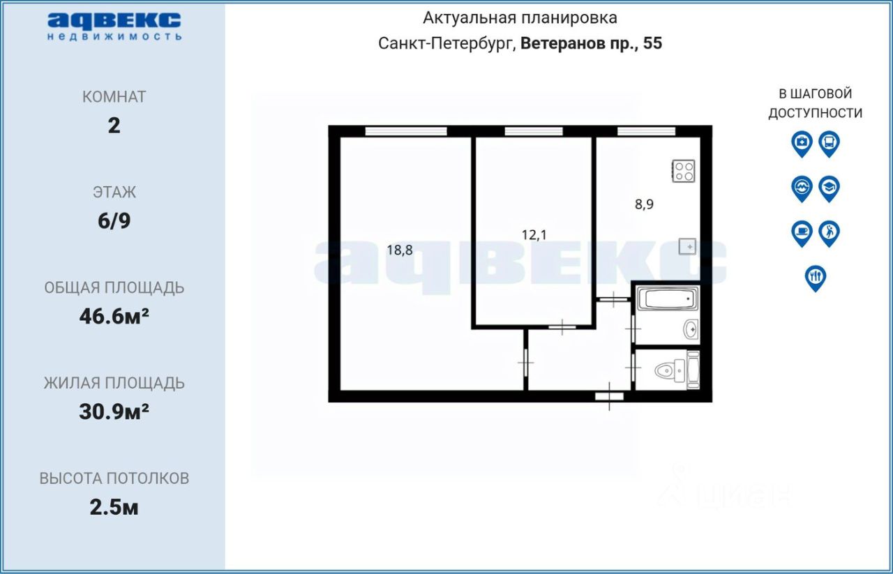 Общая площадь квартиры 46,6 кв.м., жилая (18,8+12,1)кв.м, комнаты изолированы, кухня 8,9 кв.м, санузел совмещен, прихожая 3,6 кв.м.. Окна квартиры выходят на проспект Ветеранов, из них виден парк Александрино. В летний и осенний период этот вид завораживает. Вход в парадную со двора, территория дома огорожена, охраняется и находится под видеонаблюдением. В парадных установлен новый домофон, сделан косметический ремонт, везде чистота и порядок. Можно подключиться к камере домофона и с телефона наблюдать территорией дома и входом в парадную.