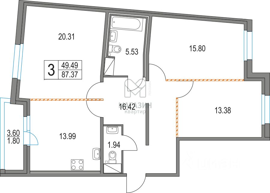 - Общая площадь - 87.4 м2, + лоджия 3.6 м2