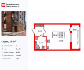 Удобная, классическая, функциональная европланировка, вместительная прихожая 3.15 м². Общая площадь студии - 25.6 м², жилая 19.15 м², высота потолка 2.77 м.