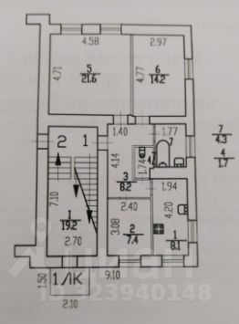Трехсторонняя квартира общей площадью 65 м.кв, состоит из трех изолированных комнат 21.6 + 14.2 + 7.4 м.кв., кухни 8.1 м.кв., раздельного санузла - ванна с окном 4.3 м.кв. и туалет 1.7 м.кв., и прихожей 8.2м.кв.