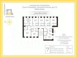 Квартира общей площадью 246.8 м2 ранее использовалась под мини-гостиницу, поэтому имеет номерную планировку, которую несложно преобразовывается в 3-5-комнатную квартиру с большой кухней-гостиной.