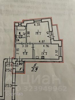 Планировка: Изолированные помещения: большая жилая комната (19.1 м²) с двумя окнами и выходом на балкон, кухня-гостиная 14.3 м², санузел с окном.