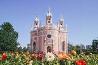 В шаге от дома Чесменская церковь - памятник архитектуры в стиле неоготики.