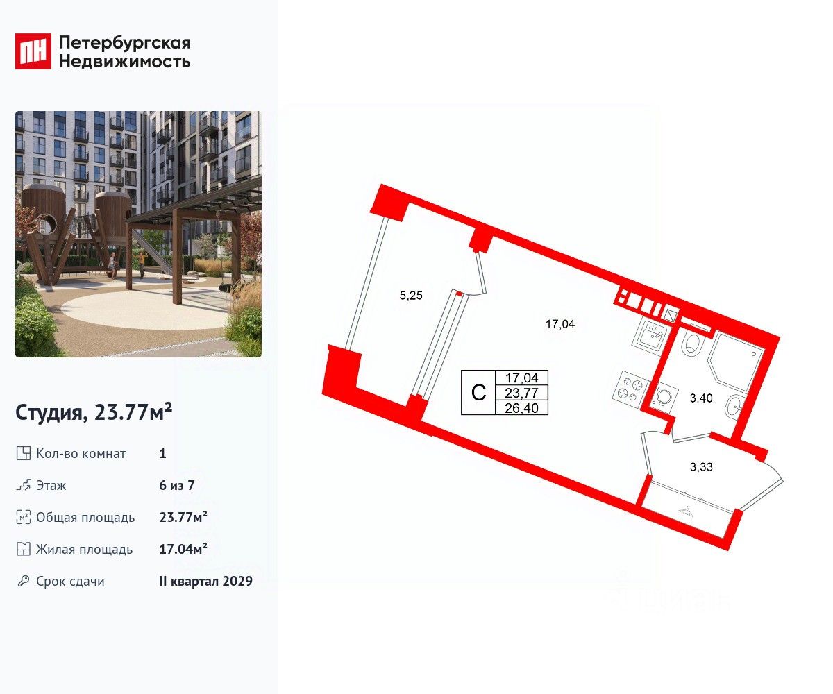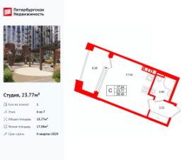 Удобная, классическая, функциональная европланировка, просторная прихожая 3.33 м². Общая площадь студии - 23.77 м², жилая 17.04 м², высота потолка 2.98 м.