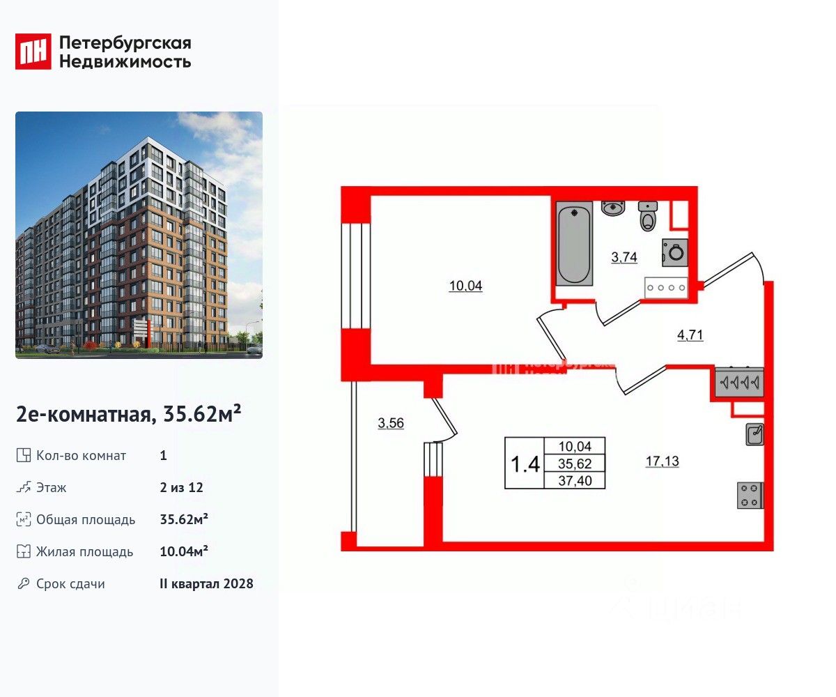 Удобная, классическая, функциональная европланировка, большая кухня-гостиная 17.13 м², просторная прихожая 4.71 м². Общая площадь квартиры - 35.62 м², жилая 10.04 м², высота потолка 2.77 м.