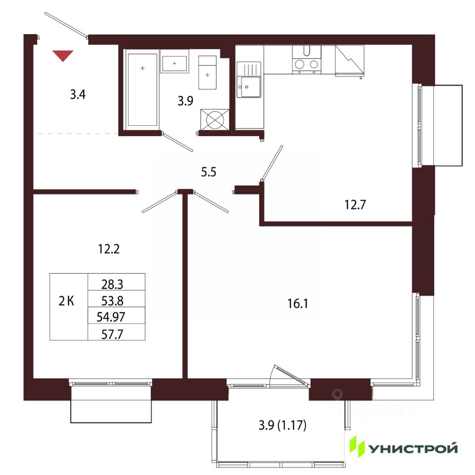 Общая площадь54,97 м²