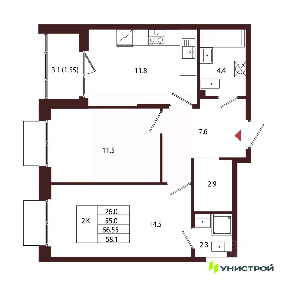 Общая площадь56,55 м²