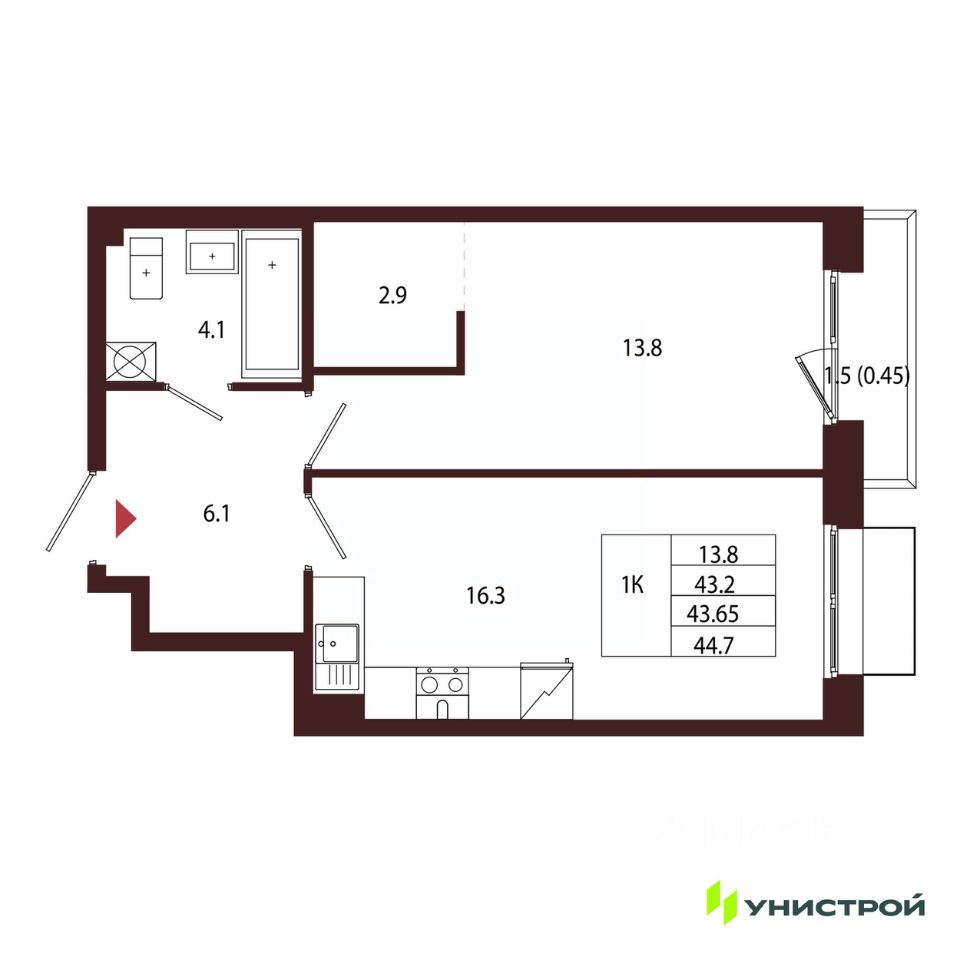 Общая площадь43,65 м²