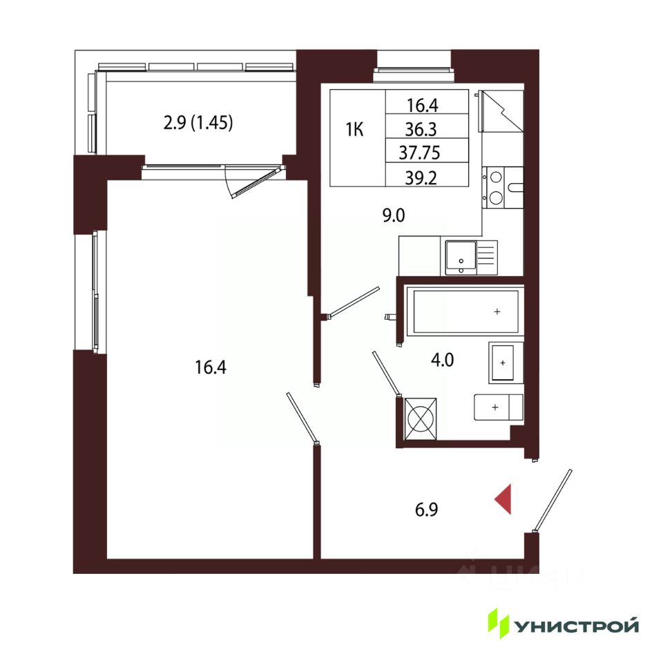 Общая площадь37,75 м²
